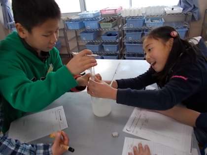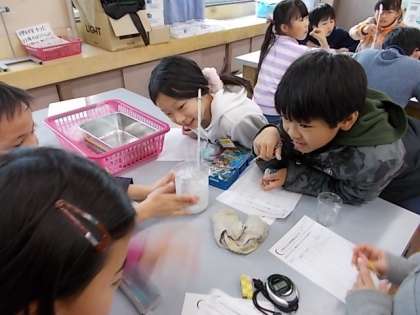 今日は,水を冷やし続けるとどうなるかについて実験しました。試験管の中の水が氷はじめると子ども達は,「わあ!凍ってきた!」と驚いていました。水は,あたためたり,冷やしたりすることで,いろいろ変るんだということを知りました。
