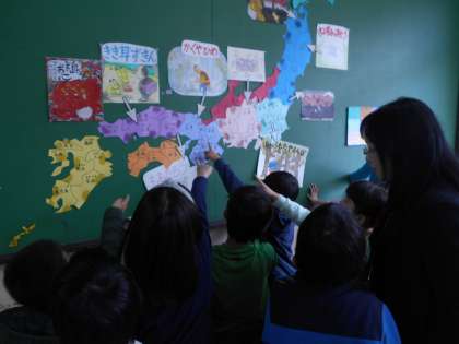 今日の中間休みは,絵本の読み聞かせがありました。大きな紙芝居に,みんな興味しんしん。方言で読んでいただいたところもありました。みんなお話の世界に引き込まれていました。読んでいただいたあとは,「どこの県のお話かな。」「ここ行ったことあるよ。」と,日本地図で知っている都道府県を探していました。