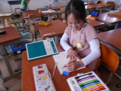 天気が悪く,外で遊ぶことができなかったので,教室で昔あそびを楽しんだり,絵をかいたりして楽しみました。遊んでいる様子を,子どもたちに写真を撮ってもらいました。なかなか上手にとれていますね。