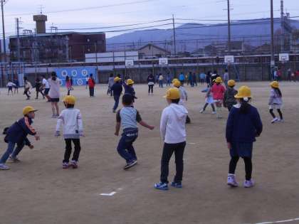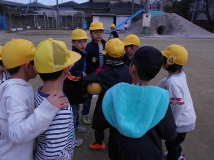 みんなで集まって,ドッヂボールをしました。一年間で,たくさん友だちができたね。
