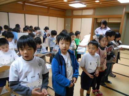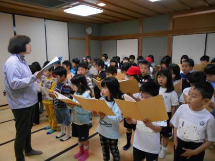 6年生をおくる会の練習をしています。「おくりもの」という歌をうたいます。高い声できれいに歌えるように,がんばって練習しています。