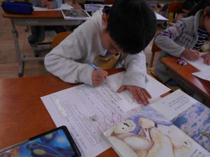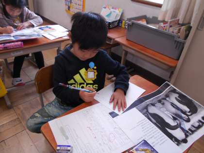 自分で調べたいと思った動物の赤ちゃんを,本で調べています。調べたことは「赤ちゃんカード」にまとめます。みんながんばってね。