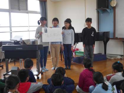 発表の練習をし始めました。練習第2回目にして,すでに素敵な発表をしている班がありました。前に出て,最初の部分をみんなに披露してくれています。