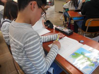 今日は,分数×分数の計算のしかたを図を使って考えました。みんなで意見をつないで考えたので,深まりましたね。一人で考える時間もしっかりと考えることができました。