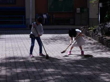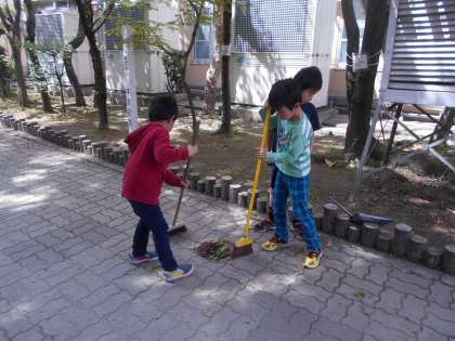 去年までは自分の教室だけを掃除していましたが,今年は学校のいろいろな場所を掃除します。中庭も,こんなにきれいになりました。