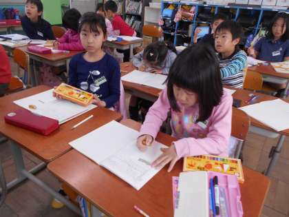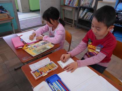 自分の好きな「給食しらべ」をするために,画用紙に顔と名前をかきました。明日の参観日に,「給食しらべ」をします。楽しみですね。
