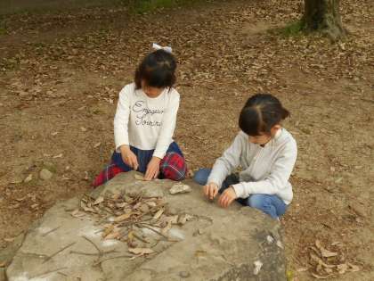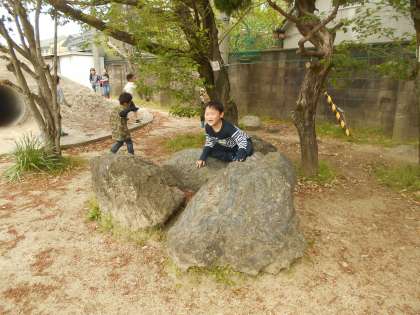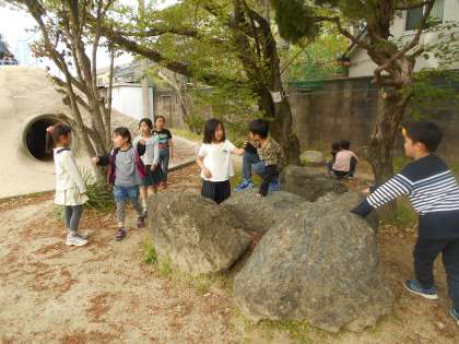 みんなで元気よく外で遊んでいます。いろいろなクラスの友だちと遊んでいますね。