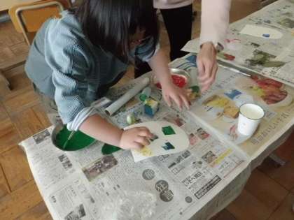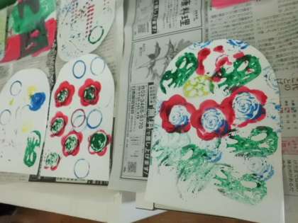 いろいろなものをスタンプにして鯉のぼりのうろこを作りました。