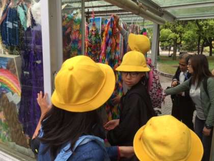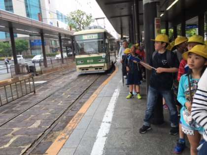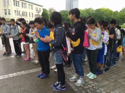 広島電鉄に乗って原爆ドームに向かいました。少し雨が降っていましたが,原爆の子の像の前で平和を祈り,黙祷をしました。