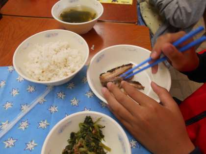 今日の給食は「さんまのかわりに」でした。魚を上手に食べることができるか映像を見ながら確認しました。骨までやわらかいので,最終的には骨までペロリといただきました。