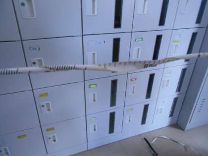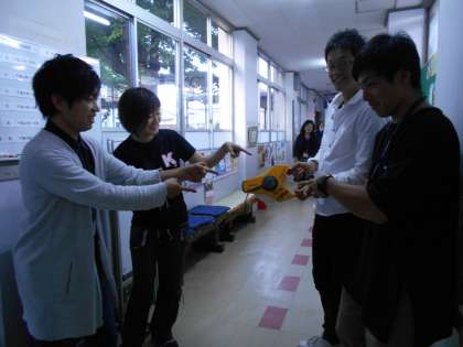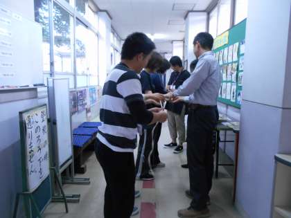 50メートルのメジャーが壊れてしまっていたので,川岡小学校の教職員で力を合わせてなおしました。巻き取っていくうちに,ねじねじねじねじ・・・中尾彬もびっくりするぐらいねじれていました。みんなでのばしながら巻き取りました。