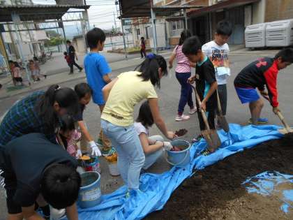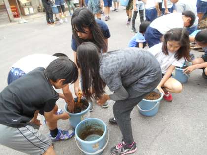 バケツに土を入れて肥料を混ぜ,水を入れてかき混ぜます。