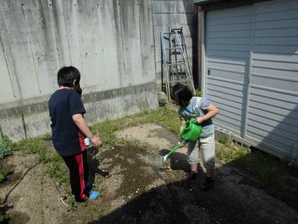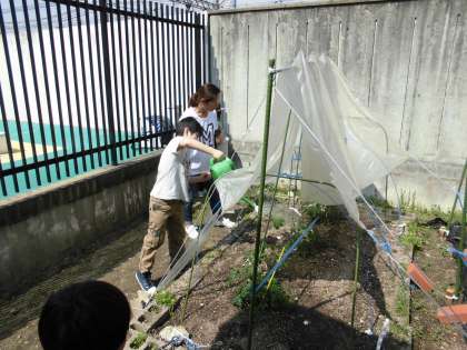 育てている野菜の様子を観察し,水やりをみんなで行いました。