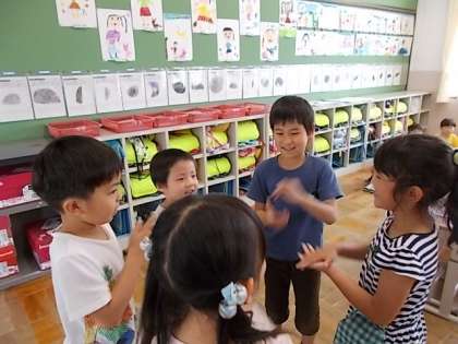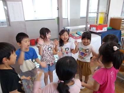 今日は,拍の流れを感じながら「なまえあそび」をして楽しみました。自分の好きなくだものの名前を決めて,手拍子に合わせて言葉を言います。みんなで合わせてやるのって楽しいね!