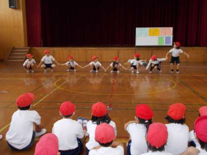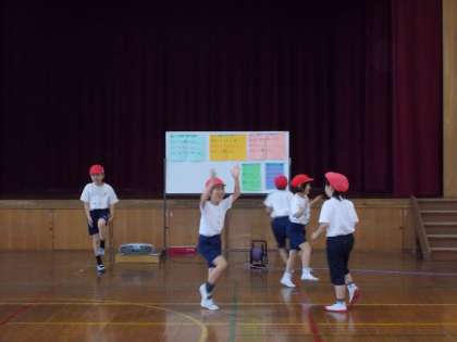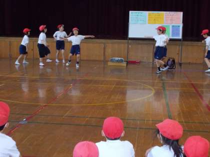 初めは,恥ずかしがって踊れなかった子どもたちも多かったのですが,だんだんリズムにのり,音楽に合わせて踊る子どもたちが増えてきました。今日は,発表会をしました。ヒップホップやジャズの曲に合わせて,楽しく踊ることができました。