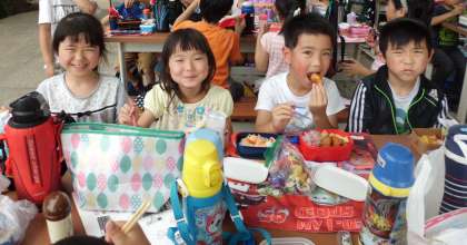 お待たせしました。校外学習の続きです。「正午」の答えは昼の12時です。算数で勉強しましたね。5分前には集合場所に戻ってきて,お弁当です。さあ,どんなお弁当かな?