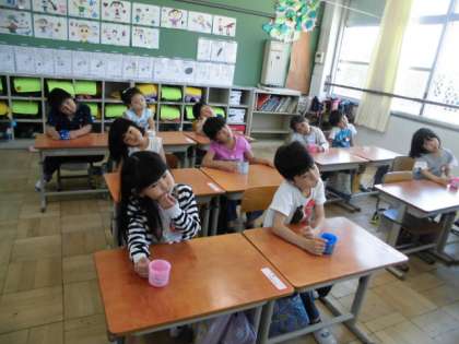 朝の時間にフッ化物をしました。しっかり虫歯予防をしましょう。