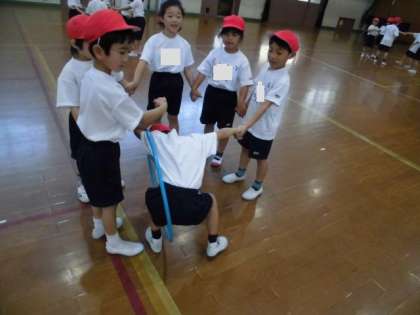 「ようぐであそぼう」の学習です。フープを使って友だちと楽しく遊びました。
