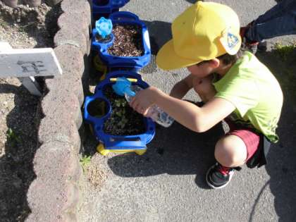 生活科の時間にたねまきしたあさがおが芽を出していました。「大きく育ってね。」という気持ちを込めてお水をあげています。