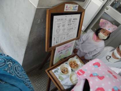 当番さんは,給食室で献立と盛り付け方を確かめています。