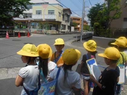 待ちにまった,町たんけんに行きました。(だじゃれではないですよ。)地下道をこえて,てくてく歩きます。色々なお店を発見しながら,てくてく歩いていきます。