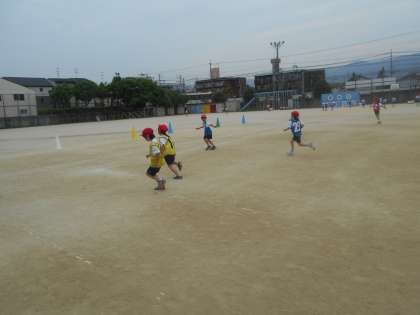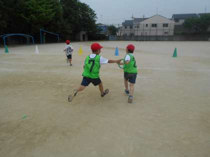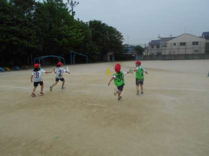 リレーあそびの学習も5回目です。後ろを見ずにバトンを受け取ったり,思いっきり手を伸ばして渡そうとしたり,がんばっています。