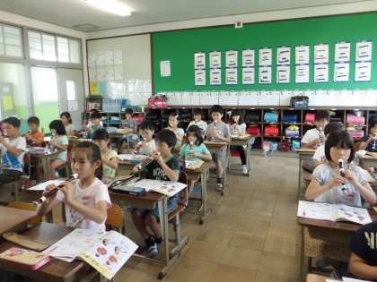 初めてリコーダーの学習をしました。ふくときの姿勢やリコーダーの持ち方を知って音を出してみました。ちょっぴりリコーダーとなかよくなれました。