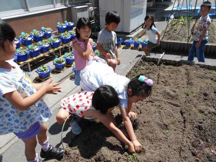 ひまわりのたねを観察し、たねをまきました。どれくらいの高さに育つか楽しみです。