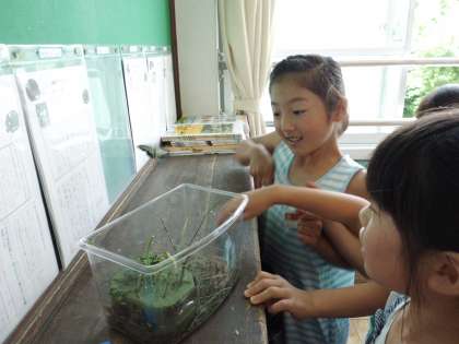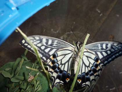 アゲハチョウの観察を続けています。幼虫からさなぎになり,きれいなアゲハチョウに変身しました。幼虫からはとても想像できない美しさに驚きました。気持ち良さそうに飛び立っていきました。