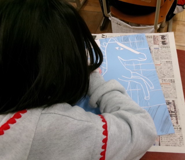 彫刻刀の使い方をしっかりと確認して、刷った時の様子をイメージしながら、彫り進めています。どんな作品に仕上がるか楽しみです♪