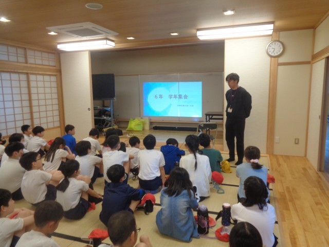 6年生がスタートしました。子どもたちはわくわく、どきどきしながら過ごしています。今日は、学年集会を行いました。6年生の心構えや行事、1年間で頑張ってほしいことなどを伝えました。最高な学年になるように、みんなでチームプレイを大切にしながら一日一日を過ごしていこうと思います。