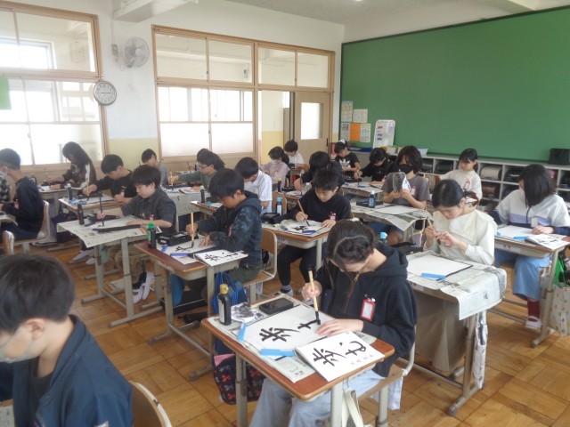 字の大きさに気を付けて書きました。「歩む」は「歩」を少し大きめに、「む」は漢字よりも少し小さめに書くといいことを知ると、大きさに気を付けて書いていました。各教室に掲示していますので、22日(水)の参観時にご覧ください。