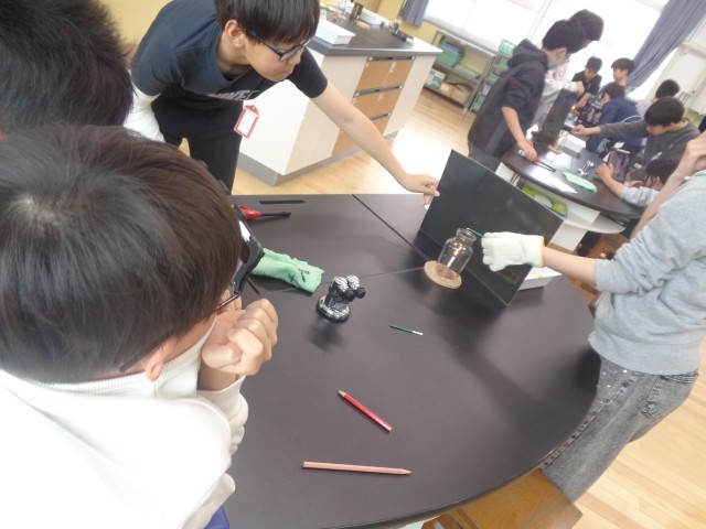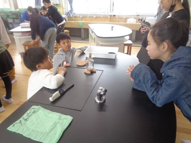 理科では「ものが燃えるしくみ」の学習をしています。ロウソクの火をいかに長く燃やすには「空気をたくさん入れたらいい。」「ふたをずらしたらいい。」などたくさん予想をしていました。実験を通して、ものをどうすれば長く燃やすことができるかを体験することができました。