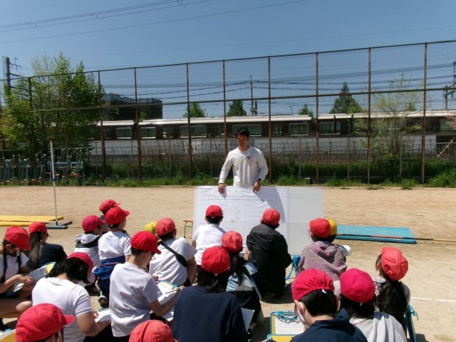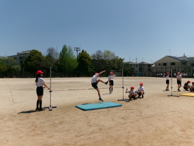 体育では高跳びの学習が始まりました。まずは4年生の時の学習を思い出して跳んでみました。