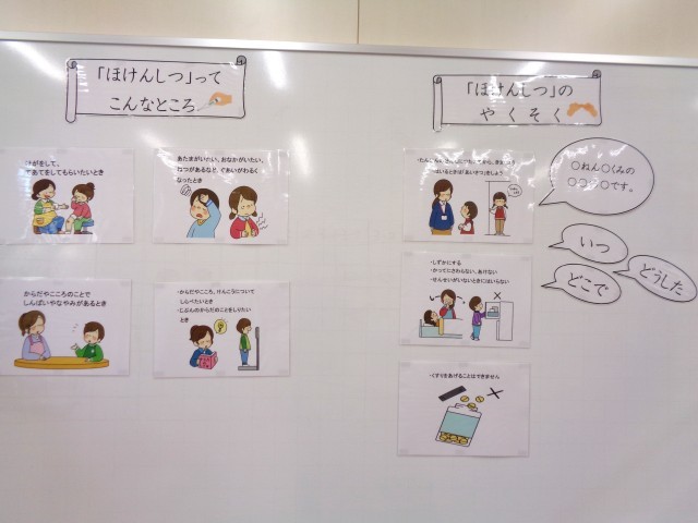 計測前に、1組と1年生には「保健室ってどんなところ?」「保健室のやくそく」の2つのお話しをしました。