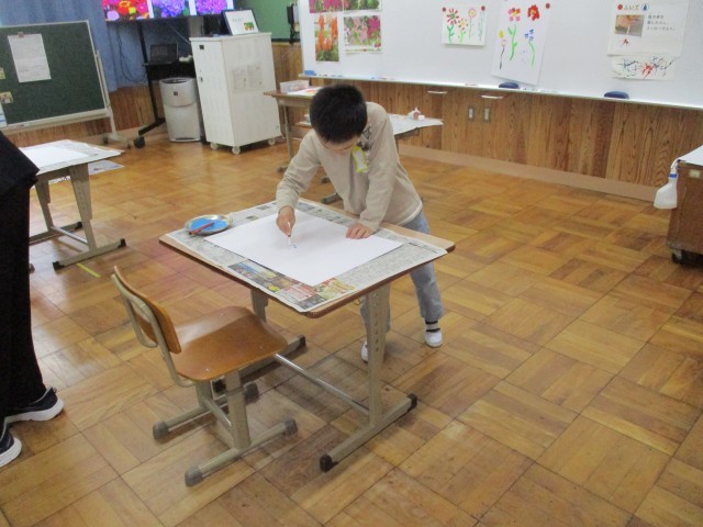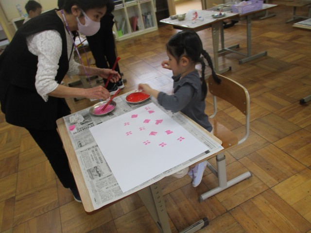 授業参観で絵の具を使って自分だけのお花をつくりました。色とりどりのお花が美しく咲きました!