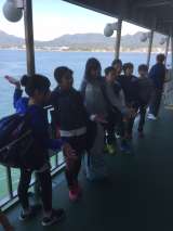 フェリーに乗って広島に帰ります。すれ違ったフェリーに「おーい」と手をふりました。