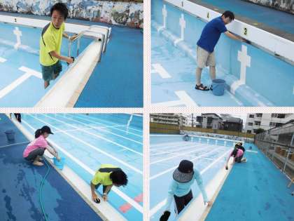 さて,6年生がプールをきれいにしてくれた後は教職員で最後の仕上げをしました。みんな気持ちよく泳げるようにと気持ちをこめてプールの壁を磨きました。