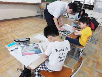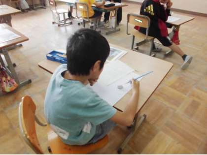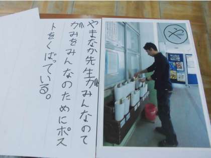 『誰がどうした』の学習をしてきたなかよし学級のみんな。お友だちや先生の写真を見て,『誰がどうした』のかの文章を考え,かるた作りをしました。みんな,一生懸命にがんばりました。