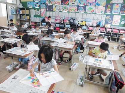 おさかなさんのうろこに全色を使って色を塗っていきました。いろいろな色のうろこを持った魚がたくさん登場し,2年生の教室はさながら『水族館の大水槽』のようでした。
