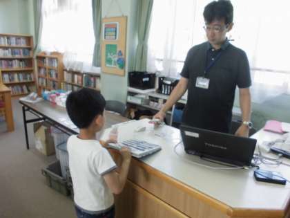 お気に入りの本を見つけに,図書室へ行きました。電車の本やお気に入りの絵本など,借りたい本がいっぱいありますが,その中から1冊借りました。教室で読みましょうね。