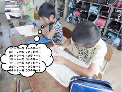 わり算を学習した3年生はプリントでしっかりと復習をします。何度も何度も問題を解いて,それこそ答えを覚えるぐらい繰り返し練習をしていきます。