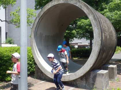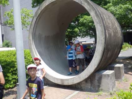 洛西浄化センターでは,家庭や工場などからの汚水や雨水が集められることやそれらの汚れた水がきれいになっていく様子を見せてもらいました。説明して頂いた内容は難しいものでしたが,実際に見学コースを進むにつれてきれいになる水や薄まっていく匂いを見たりかいだりすることで,浄化センターの役割を実感できたようでした。また,下水道管の見本の中を通り,その大きさを知ることもできました。