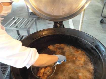こうして,しっかり鰆(さわら)が「塩こうじ」に漬かったら,今度はからっと揚がるよう,漬け汁をきって,米粉と片くり粉をうすくきれいに衣づけします。