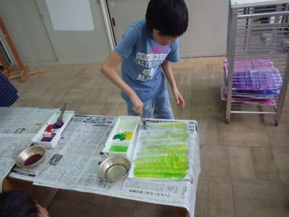 赤・青・紫色から花の色を選び、和紙に塗りました。