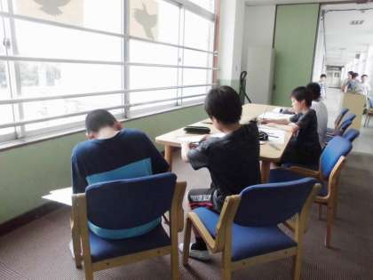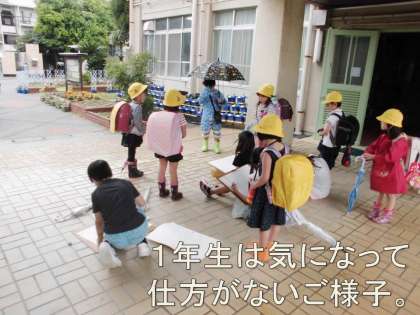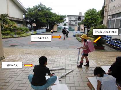 6年生が校舎内のいろいろな場所で絵をかいています。『わたしの大切な風景』を自分で探し,その場所で絵をかいているのです。その様子を,5時間授業で下校をする1年生が興味津々に見つめています。
