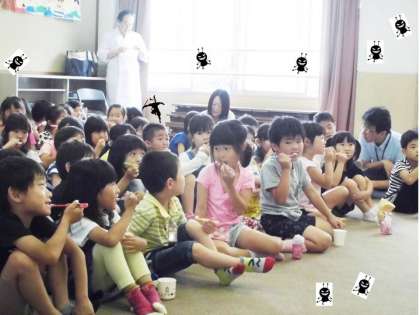 歯みがきの巡回指導がありました。1年生が大好きなおやつやジュース。たくさん食べたり飲んだりして,歯みがきをしないでおくとお口の中が大変なことに・・・。