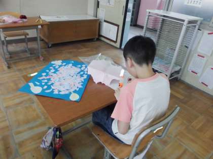 青や紫などの色を塗った和紙をちぎっていきます。そして上手に貼っていきました。