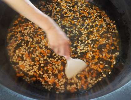 うまみがいっぱいの,大豆のゆで汁や昆布の漬け汁を使って炊くこともおいしさの秘密です。