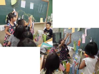 短冊に願いを書いて織姫さまと彦星さまにお願いしました。自由参観の日に作った飾りもきれいに飾りつけました。
